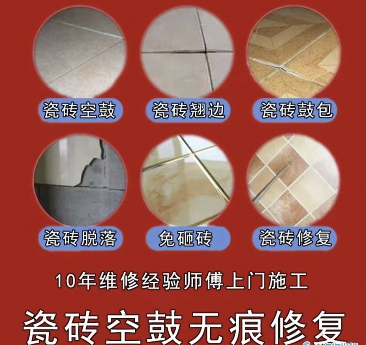 免砸砖修复瓷砖空鼓,翘边,变形,松动,解决各类瓷砖问题!17882178208