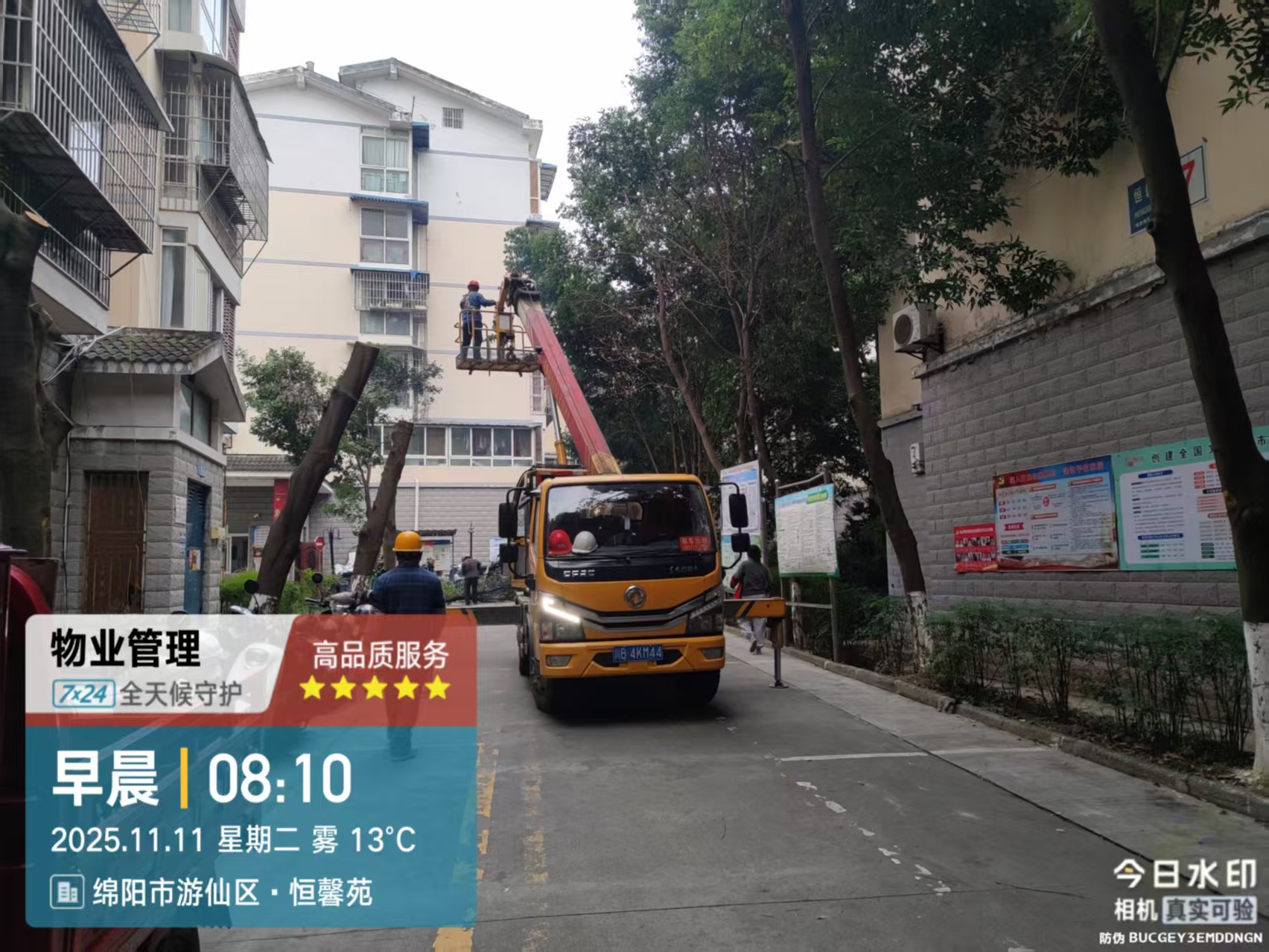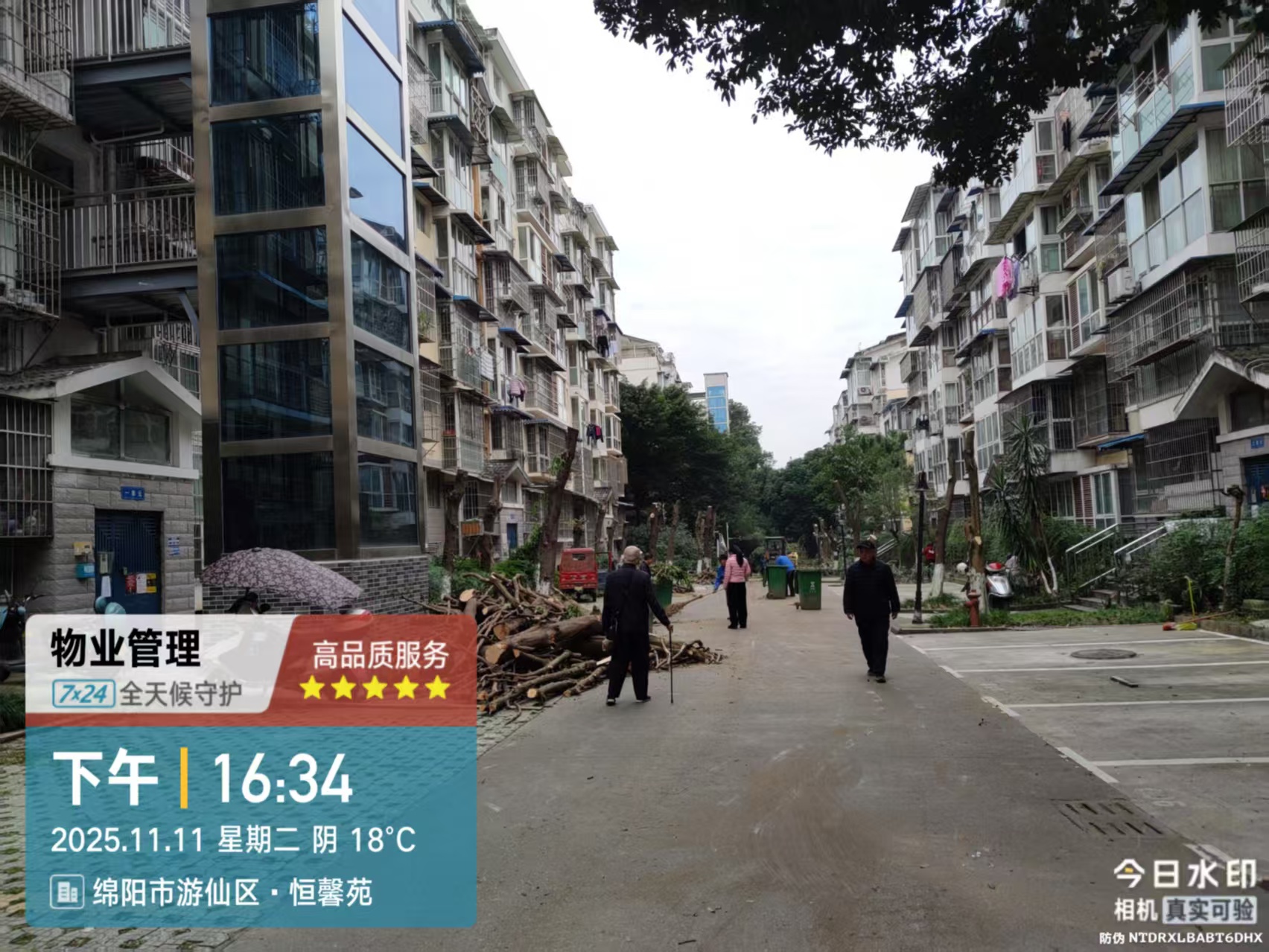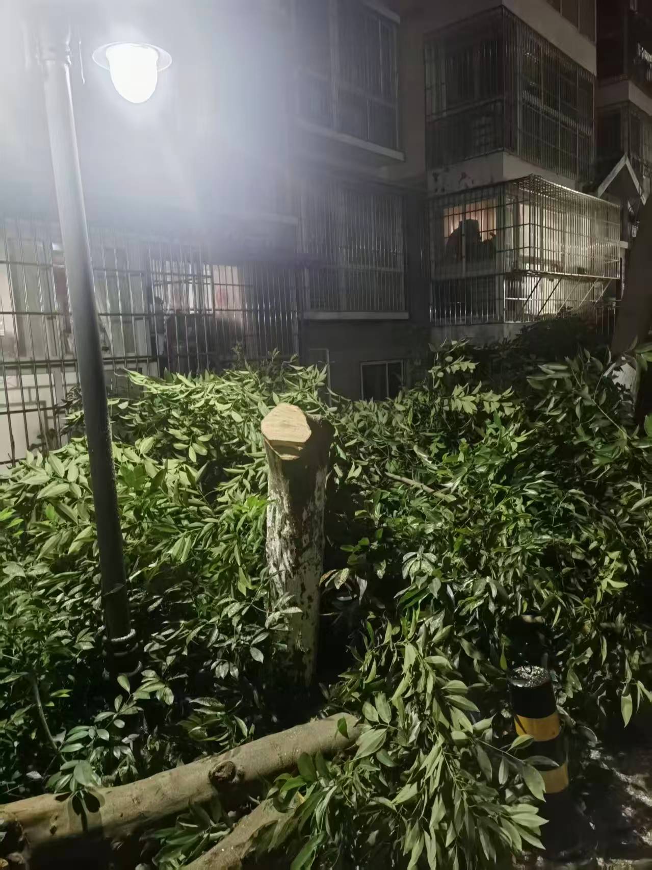 游仙区恒馨苑小区内大量生长20年的绿化树木,被物业砍成树桩了,有的树桩桩还没有小汽车高,有的只差把树根扒起来了。这样的结果不知是哪个相关的部门审批让物业公司搞的?究竟是否合法、合规?
