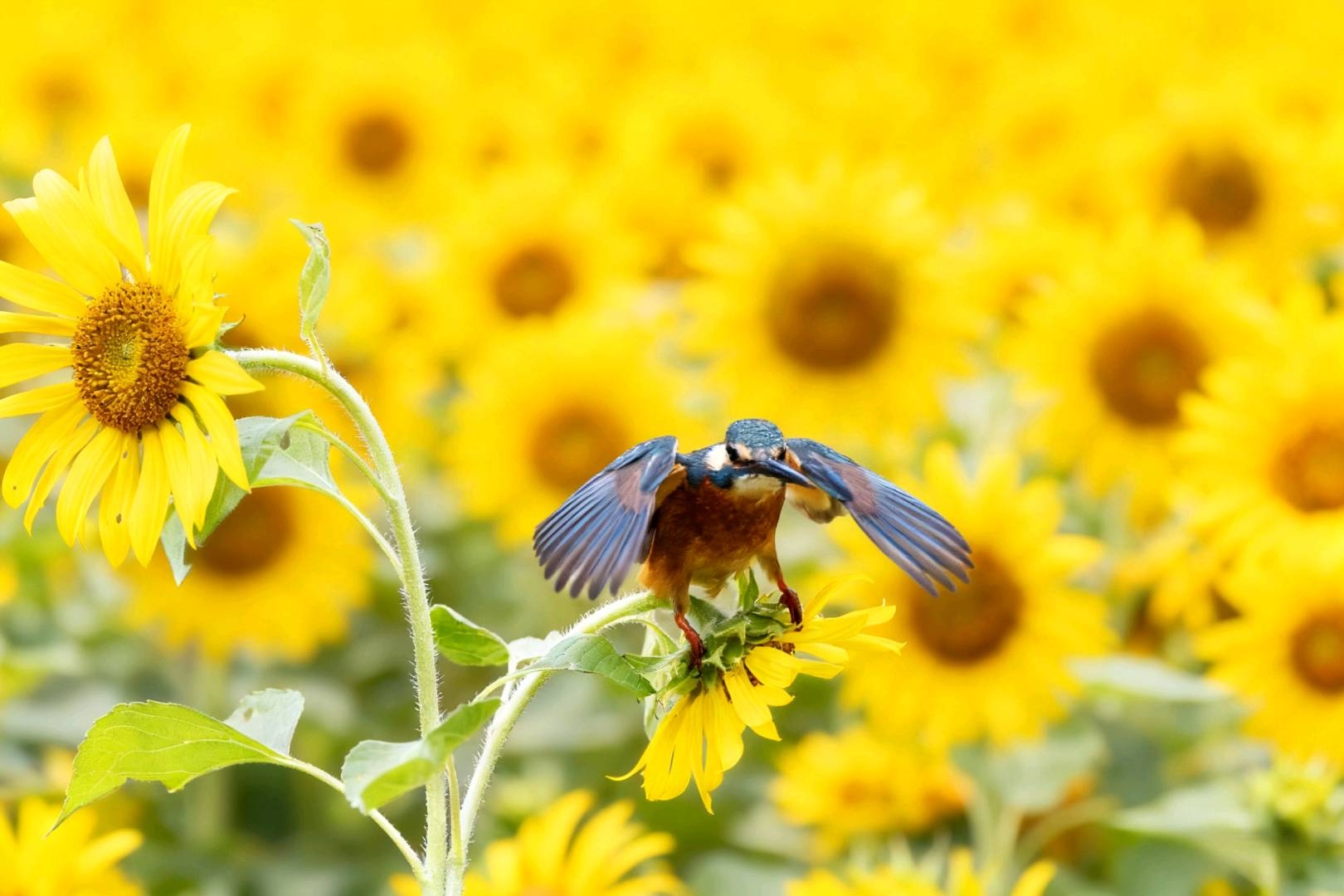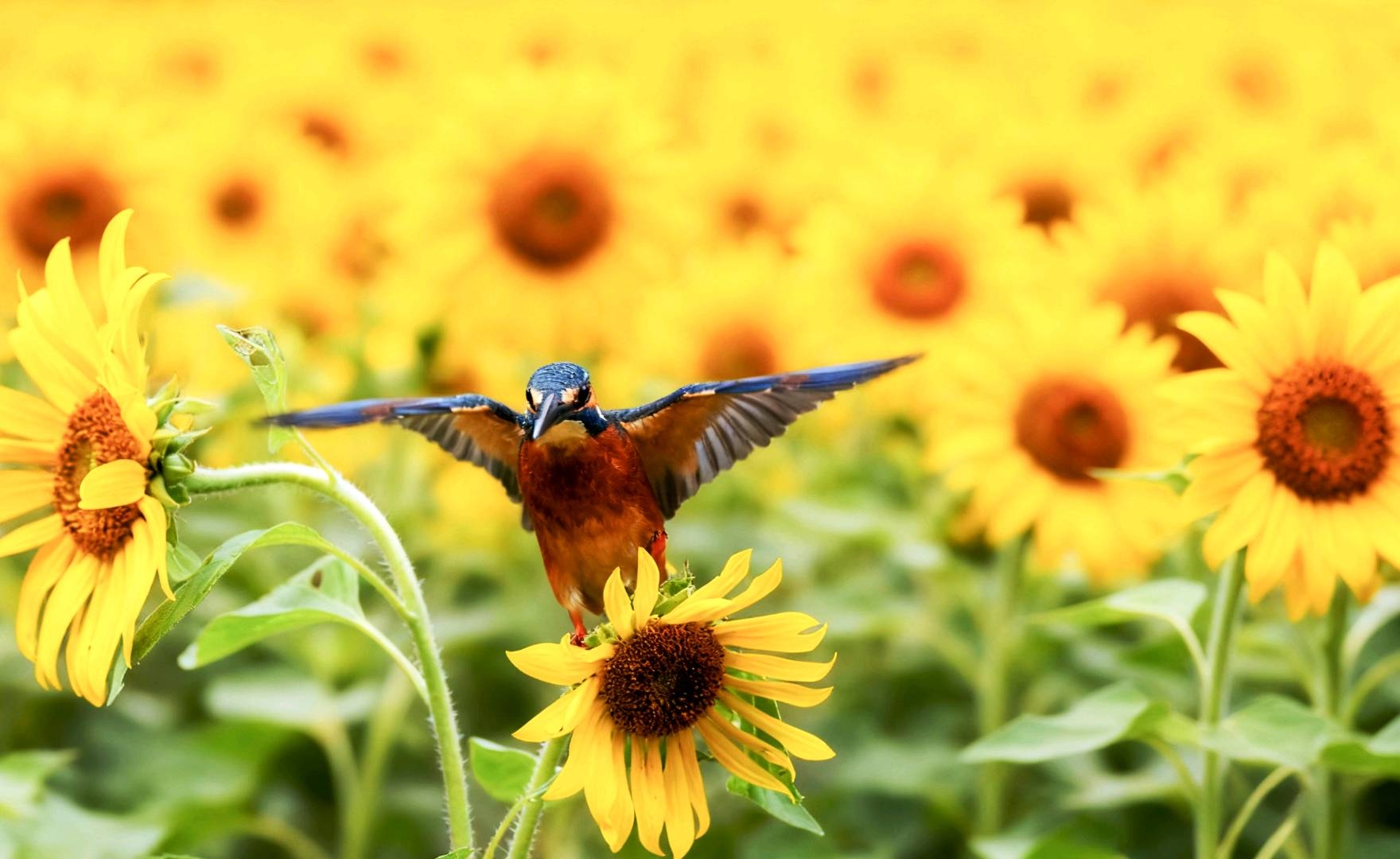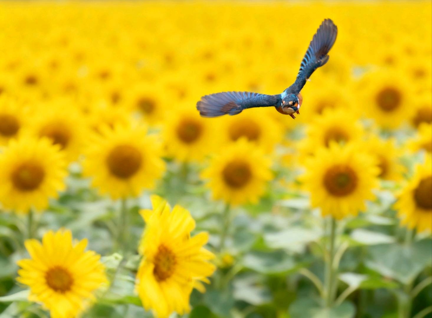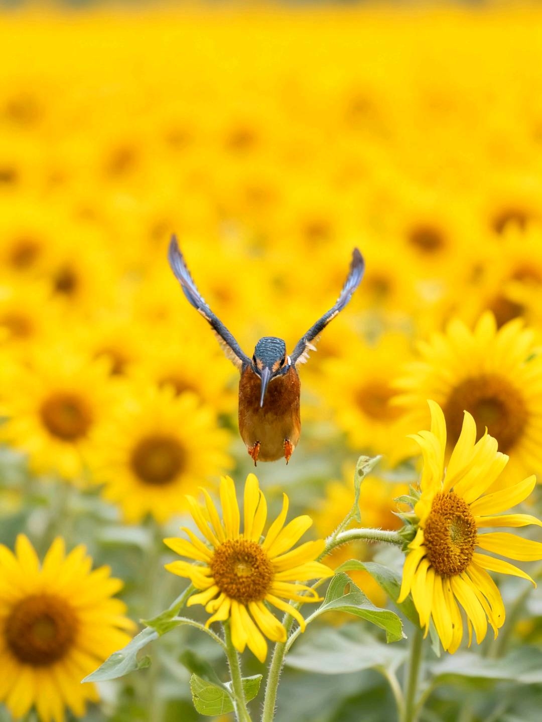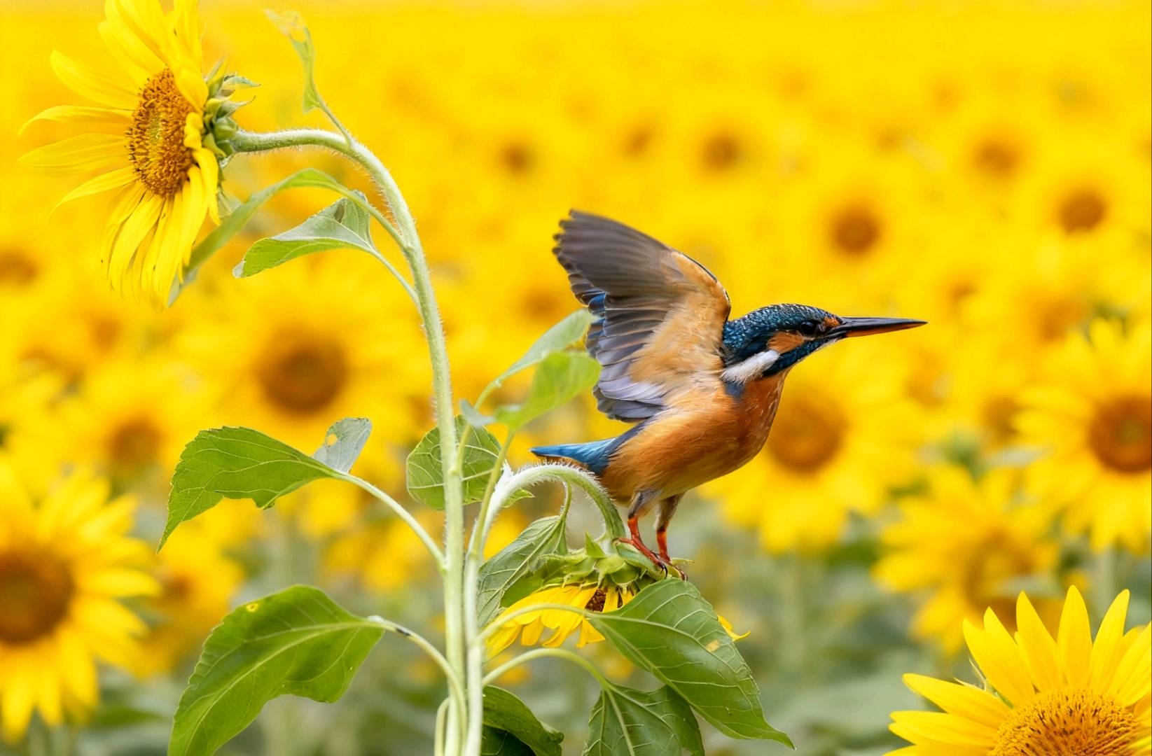 翠鸟在向日葵花田中的画面,是「明亮色彩+灵动动态」交织出的视觉治愈感。翠鸟羽毛的宝石蓝(头顶、翅膀)、暖橙黄(腹部),搭配颈部的白色细纹,像把“自然调色盘”落在明黄色的向日葵花海中——暖黄背景衬得翠鸟的蓝更清透、橙更温柔,撞色却不刺眼,满是夏日的明快张力。向日葵是舒展的静态(金黄花瓣、纤嫩茎叶),而翠鸟振开的翅膀带着羽毛的蓬松纹理,仿佛下一秒就要掠过低垂的花盘,这种“花海的静”裹着“飞鸟的动”,让画面瞬间活了起来,不呆板、有呼吸感。虚化的花田背景(模糊的金黄花盘)托着清晰的翠鸟与近景向日葵,层次分明又柔和,既突出了翠鸟灵动的姿态,也没丢了花田的暖融融氛围,像把“生机”揉进了明亮的色块里。