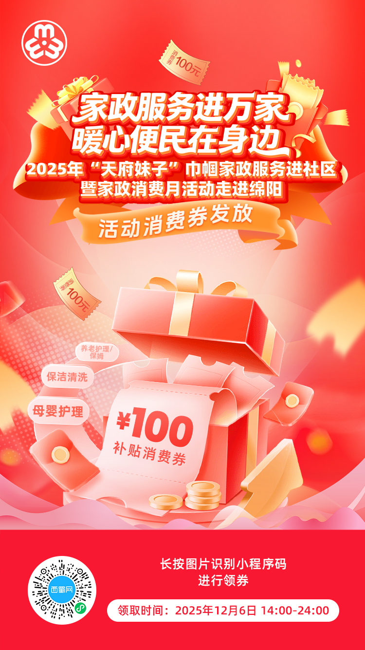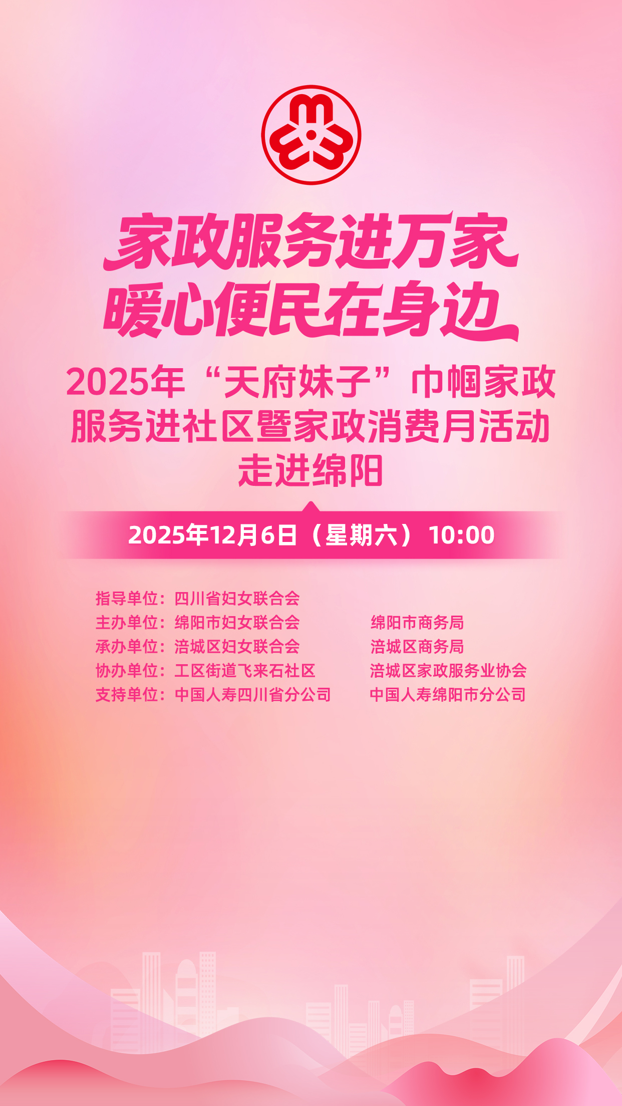 为促进家政服务业提质扩容,做优“天府妹子”巾帼家政品牌,推动巾帼家政服务深入社区、服务家庭,在四川省妇联的指导下,绵阳市妇联、涪城区妇联联合商务部门,将举行2025年“天府妹子”巾帼家政服务进社区暨家政消费月走进绵阳系列活动。